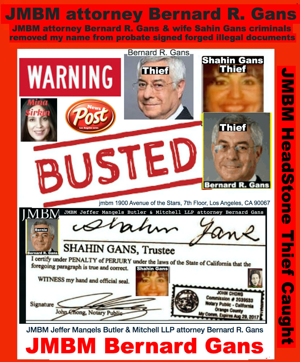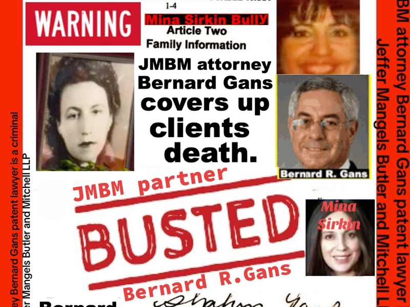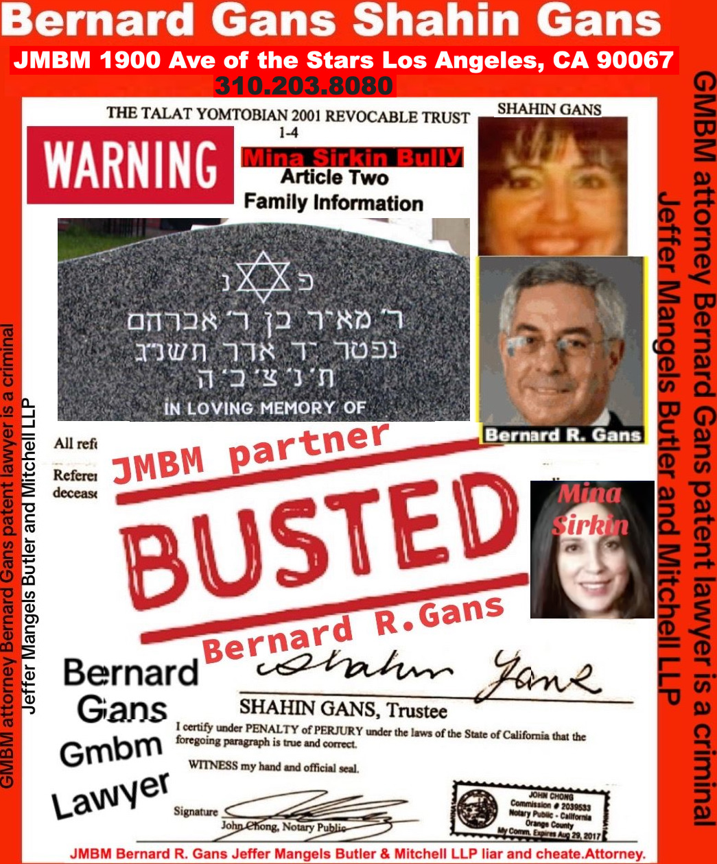 Bernard R. Gans | Lawyers | Articles | Jeffer Mangels Butler & Mitchel LLP Luigi Bian $800,000,000.00 jmbm LAWSUIT STRIKES SUING anti semitic anti jew JMBM California Business Lawyers Jeffer Mangels Butler & Mitchell LLP unlicensed practicing partner attorney Bernard R. Gans $800,000,000.00 FOR KILLING MOM.