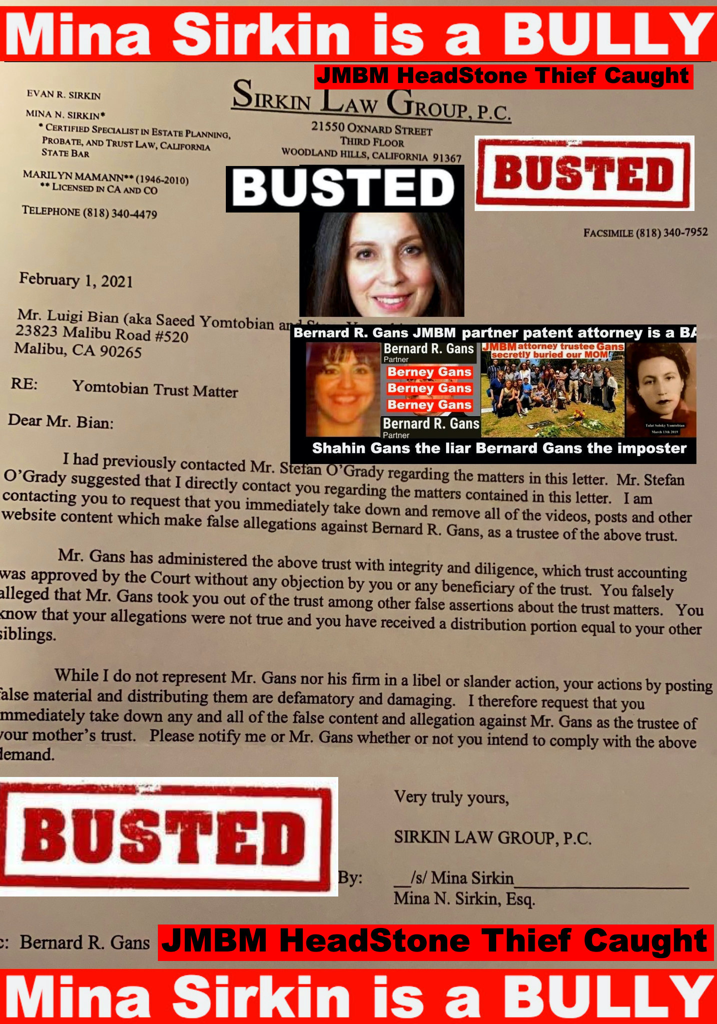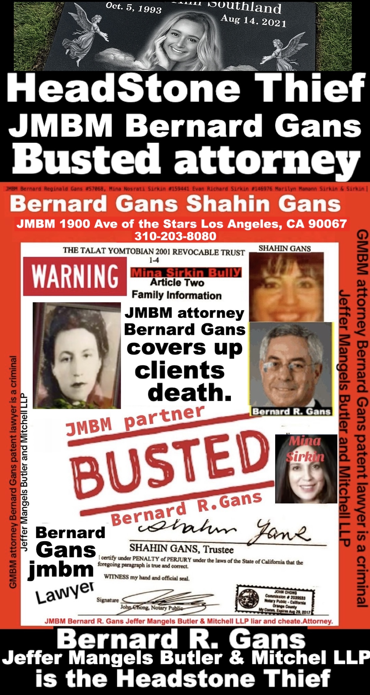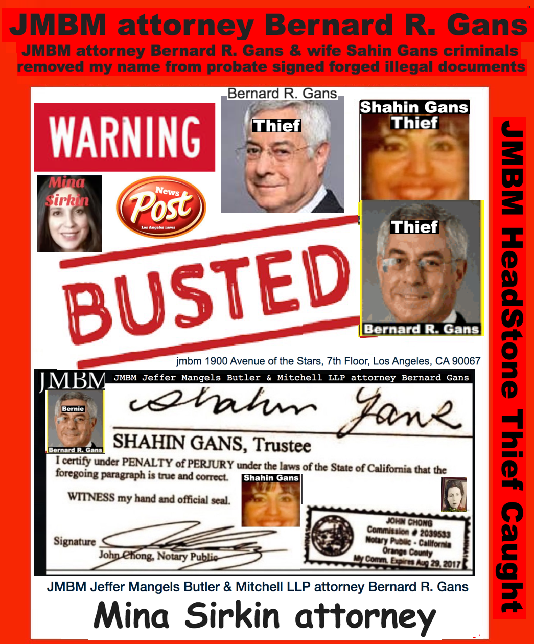 Bernard R. Gans | Lawyers | Articles | Jeffer Mangels Butler & Mitchel LLP Luigi Bian $800,000,000.00 jmbm LAWSUIT STRIKES SUING anti semitic anti jew JMBM California Business Lawyers Jeffer Mangels Butler & Mitchell LLP unlicensed practicing partner attorney Bernard R. Gans $800,000,000.00 FOR KILLING MOM.